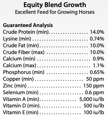 Equity Blend provides high-quality protein (essential amino acids) fortified with natural vitamin E, a source of omega 3 fatty acids and chelated minerals, and is fueled by a balance of carbohydrates and soybean oil for sound growth. The requirements of pregnant mares and breeding stallions are provided by the same formula. The same blend of carbohydrates and soybean oil also provides the quick energy needed to meet the anaerobic demands of the equine athlete as well as adding the stamina and endurance factor.