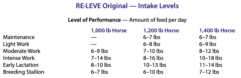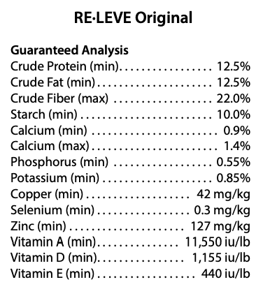 RE•LEVE Original is formulated to meet the energy and nutrient demands of horses with moderate to high energy needs. Useful in the management of tying-up syndrome caused by RER, PSSM or ESPM as well as laminitis and Cushing’s disease. Provides high levels of easily digested energy from fat and fermentable fiber. Contains essential vitamins and minerals with a minimal amount of starch.